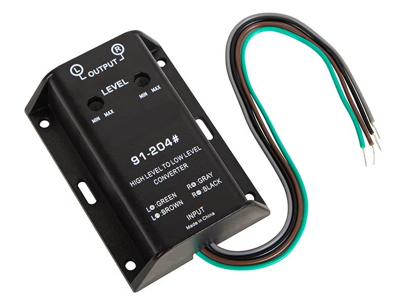 Adapter för att omvandla högnivåsignaler (högtalarutgångar) till lågnivåsignaler för anslutning av förstärkare. Guldpläterade RCA-kontakter. Justerbar utnivå.